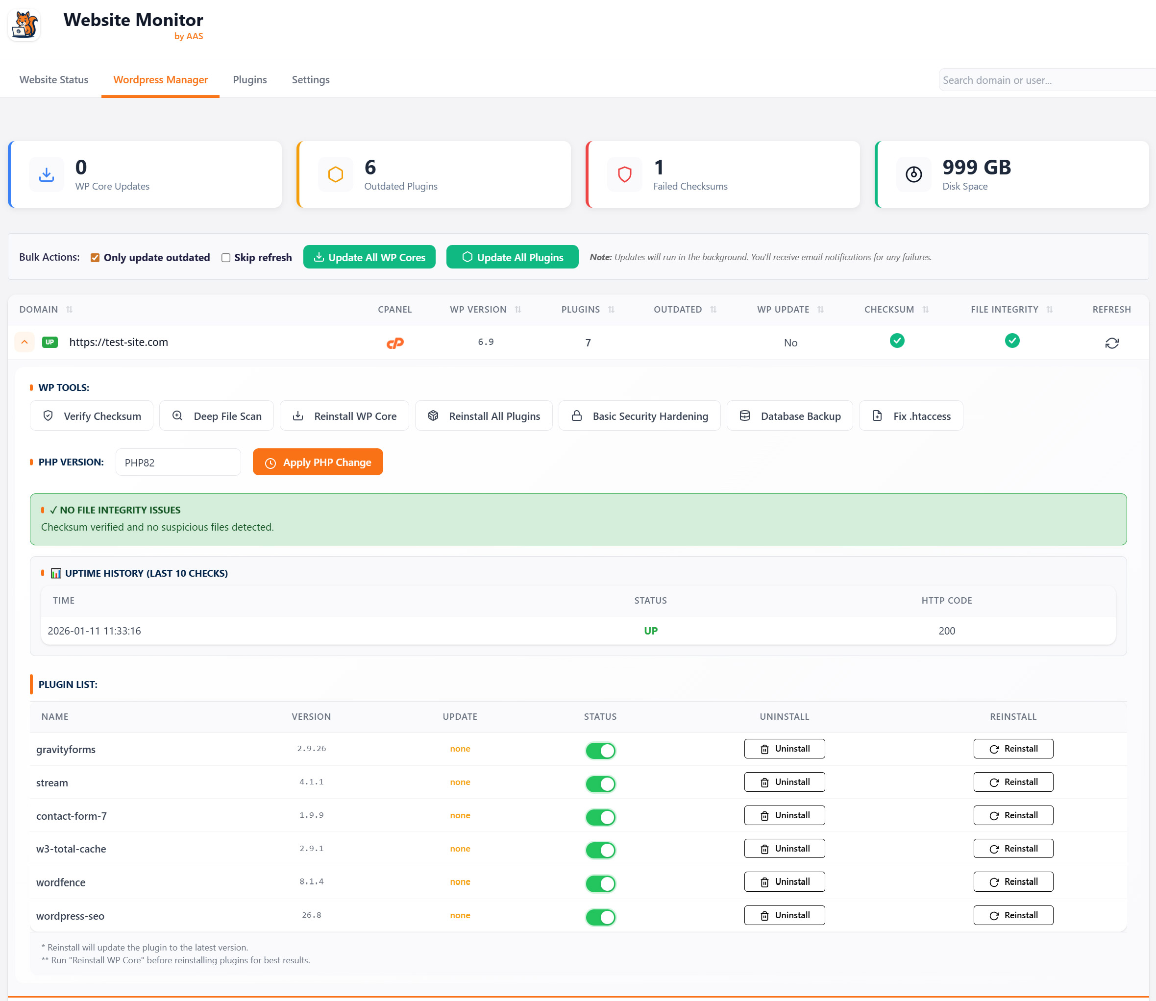 Monitor uptime, manage updates, and secure every WordPress site on your server β without leaving WHM.